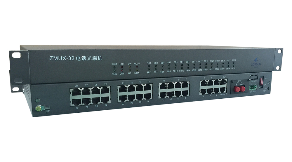 ZMUX-32-30 30路電話光端機通過光纖傳輸1~30路電話 采用模塊化設計,配備16塊業務模塊,主要完成電話、4線音頻(E&M)、RS232、網絡等多業務接入,通過復用到1路光信號傳輸,實現多業務信號點對點通信功能。